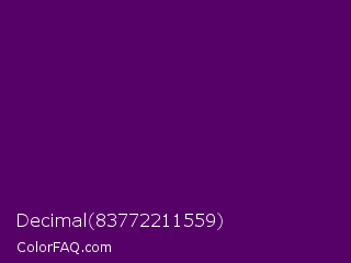 Decimal 83772211559 Color is a very dark purple color and the nearest color is Clairvoyant #480656. Hex code #560167 and RGB value is rgb(86,1,103). In RGB color space, this color is composed of 34% red, 0% green, 40% blue, In CMYK color space, this color is composed of 17% cyan, 99% magenta, 0% yellow , 60% black , In HSL color space, this color has a hue angle of 290° , 98% saturation and 20% lightness.