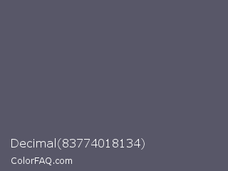 Decimal 83774018134 Color is a normal indigo color and the nearest color is Scarpa Flow #585562. Hex code #585768 and RGB value is rgb(88,87,104). In RGB color space, this color is composed of 35% red, 34% green, 41% blue, In CMYK color space, this color is composed of 15% cyan, 16% magenta, 0% yellow , 59% black , In HSL color space, this color has a hue angle of 244° , 9% saturation and 37% lightness.
