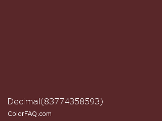Decimal 83774358593 Color is a dark red color and the nearest color is Caput Mortuum #592720. Hex code #592729 and RGB value is rgb(89,39,41). In RGB color space, this color is composed of 35% red, 15% green, 16% blue, In CMYK color space, this color is composed of 0% cyan, 56% magenta, 54% yellow , 65% black , In HSL color space, this color has a hue angle of 358° , 39% saturation and 25% lightness.