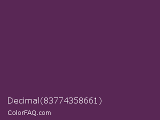 Decimal 83774358661 Color is a dark magenta color and the nearest color is Japanese Violet #5b3256. Hex code #592755 and RGB value is rgb(89,39,85). In RGB color space, this color is composed of 35% red, 15% green, 33% blue, In CMYK color space, this color is composed of 0% cyan, 56% magenta, 4% yellow , 65% black , In HSL color space, this color has a hue angle of 305° , 39% saturation and 25% lightness.