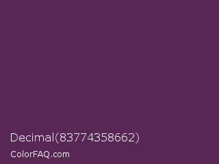 Decimal 83774358662 Color is a dark magenta color and the nearest color is Japanese Violet #5b3256. Hex code #592756 and RGB value is rgb(89,39,86). In RGB color space, this color is composed of 35% red, 15% green, 34% blue, In CMYK color space, this color is composed of 0% cyan, 56% magenta, 3% yellow , 65% black , In HSL color space, this color has a hue angle of 304° , 39% saturation and 25% lightness.