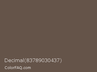 Decimal 83789030437 Color is a normal orange color and the nearest color is Umber #635147. Hex code #655449 and RGB value is rgb(101,84,73). In RGB color space, this color is composed of 40% red, 33% green, 29% blue, In CMYK color space, this color is composed of 0% cyan, 17% magenta, 28% yellow , 60% black , In HSL color space, this color has a hue angle of 24° , 16% saturation and 34% lightness.