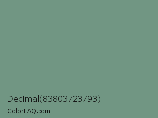 Decimal 83803723793 Color is a normal green color and the nearest color is Oxley #779e86. Hex code #719683 and RGB value is rgb(113,150,131). In RGB color space, this color is composed of 44% red, 59% green, 51% blue, In CMYK color space, this color is composed of 25% cyan, 0% magenta, 13% yellow , 41% black , In HSL color space, this color has a hue angle of 149° , 15% saturation and 52% lightness.