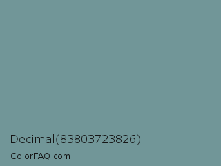 Decimal 83803723826 Color is a normal cyan color and the nearest color is Juniper #6d9292. Hex code #719698 and RGB value is rgb(113,150,152). In RGB color space, this color is composed of 44% red, 59% green, 60% blue, In CMYK color space, this color is composed of 26% cyan, 1% magenta, 0% yellow , 40% black , In HSL color space, this color has a hue angle of 183° , 16% saturation and 52% lightness.