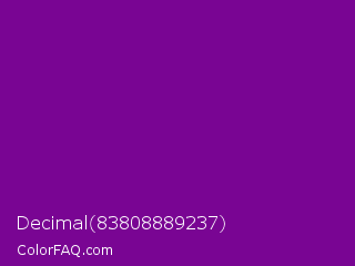 Decimal 83808889237 Color is a dark purple color and the nearest color is Dark Magenta #8b008b. Hex code #790593 and RGB value is rgb(121,5,147). In RGB color space, this color is composed of 47% red, 2% green, 58% blue, In CMYK color space, this color is composed of 18% cyan, 97% magenta, 0% yellow , 42% black , In HSL color space, this color has a hue angle of 289° , 93% saturation and 30% lightness.