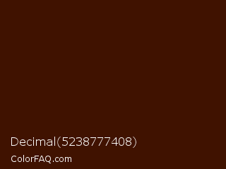 Decimal 5238777408 Color is a very dark orange color and the nearest color is Brown Pod #401801. Hex code #401200 and RGB value is rgb(64,18,0). In RGB color space, this color is composed of 25% red, 7% green, 0% blue, In CMYK color space, this color is composed of 0% cyan, 72% magenta, 100% yellow , 75% black , In HSL color space, this color has a hue angle of 17° , 100% saturation and 13% lightness.