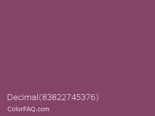 Decimal 83822745376 Color is a normal magenta color and the nearest color is Cannon Pink #894367. Hex code #844368 and RGB value is rgb(132,67,104). In RGB color space, this color is composed of 52% red, 26% green, 41% blue, In CMYK color space, this color is composed of 0% cyan, 49% magenta, 21% yellow , 48% black , In HSL color space, this color has a hue angle of 326° , 33% saturation and 39% lightness.