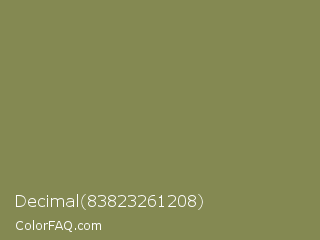 Decimal 83823261208 Color is a normal yellow color and the nearest color is Dark Tan #918151. Hex code #848952 and RGB value is rgb(132,137,82). In RGB color space, this color is composed of 52% red, 54% green, 32% blue, In CMYK color space, this color is composed of 4% cyan, 0% magenta, 40% yellow , 46% black , In HSL color space, this color has a hue angle of 65° , 25% saturation and 43% lightness.