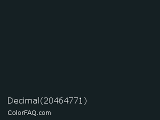 Decimal 20464771 Color is a very dark cyan color and the nearest color is Dark Jungle Green #1a2421. Hex code #152023 and RGB value is rgb(21,32,35). In RGB color space, this color is composed of 8% red, 13% green, 14% blue, In CMYK color space, this color is composed of 40% cyan, 9% magenta, 0% yellow , 86% black , In HSL color space, this color has a hue angle of 193° , 25% saturation and 11% lightness.