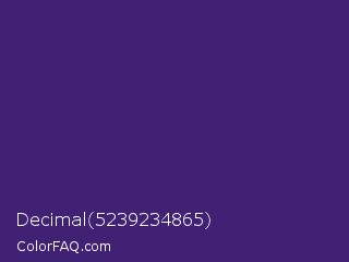 Decimal 5239234865 Color is a dark violet color and the nearest color is Meteorite #3c1f76. Hex code #412173 and RGB value is rgb(65,33,115). In RGB color space, this color is composed of 25% red, 13% green, 45% blue, In CMYK color space, this color is composed of 43% cyan, 71% magenta, 0% yellow , 55% black , In HSL color space, this color has a hue angle of 263° , 55% saturation and 29% lightness.