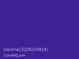 Decimal 5239234918 Color is a normal indigo color and the nearest color is Daisy Bush #4f2398. Hex code #412196 and RGB value is rgb(65,33,150). In RGB color space, this color is composed of 25% red, 13% green, 59% blue, In CMYK color space, this color is composed of 57% cyan, 78% magenta, 0% yellow , 41% black , In HSL color space, this color has a hue angle of 256° , 64% saturation and 36% lightness.