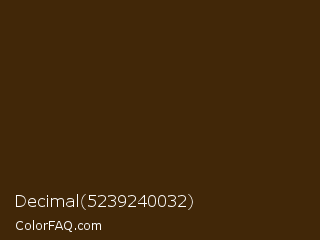Decimal 5239240032 Color is a very dark orange color and the nearest color is Bronze Pantone #3f2109. Hex code #412708 and RGB value is rgb(65,39,8). In RGB color space, this color is composed of 25% red, 15% green, 3% blue, In CMYK color space, this color is composed of 0% cyan, 40% magenta, 88% yellow , 75% black , In HSL color space, this color has a hue angle of 33° , 78% saturation and 14% lightness.