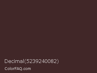 Decimal 5239240082 Color is a very dark red color and the nearest color is Crater Brown #462425. Hex code #412728 and RGB value is rgb(65,39,40). In RGB color space, this color is composed of 25% red, 15% green, 16% blue, In CMYK color space, this color is composed of 0% cyan, 40% magenta, 38% yellow , 75% black , In HSL color space, this color has a hue angle of 358° , 25% saturation and 20% lightness.