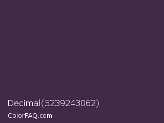 Decimal 5239243062 Color is a very dark purple color and the nearest color is Martinique #363050. Hex code #412948 and RGB value is rgb(65,41,72). In RGB color space, this color is composed of 25% red, 16% green, 28% blue, In CMYK color space, this color is composed of 10% cyan, 43% magenta, 0% yellow , 72% black , In HSL color space, this color has a hue angle of 286° , 27% saturation and 22% lightness.