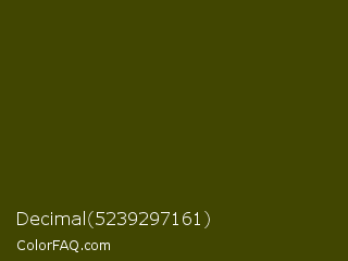 Decimal 5239297161 Color is a very dark yellow color and the nearest color is Verdun Green #495400. Hex code #414601 and RGB value is rgb(65,70,1). In RGB color space, this color is composed of 25% red, 27% green, 0% blue, In CMYK color space, this color is composed of 7% cyan, 0% magenta, 99% yellow , 73% black , In HSL color space, this color has a hue angle of 64° , 97% saturation and 14% lightness.