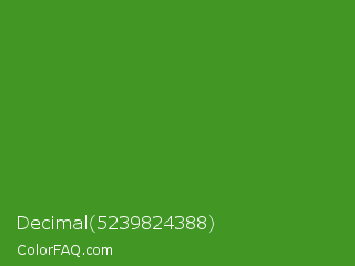Decimal 5239824388 Color is a normal green color and the nearest color is Vida Loca #549019. Hex code #419624 and RGB value is rgb(65,150,36). In RGB color space, this color is composed of 25% red, 59% green, 14% blue, In CMYK color space, this color is composed of 57% cyan, 0% magenta, 76% yellow , 41% black , In HSL color space, this color has a hue angle of 105° , 61% saturation and 36% lightness.