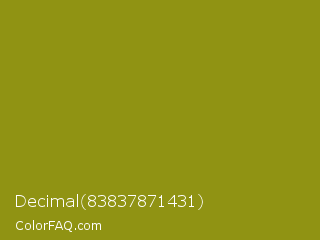 Decimal 83837871431 Color is a normal yellow color and the nearest color is Dark Yellow #9b870c. Hex code #909313 and RGB value is rgb(144,147,19). In RGB color space, this color is composed of 56% red, 58% green, 7% blue, In CMYK color space, this color is composed of 2% cyan, 0% magenta, 87% yellow , 42% black , In HSL color space, this color has a hue angle of 61° , 77% saturation and 33% lightness.