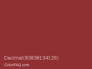 Decimal 83838134129 Color is a normal red color and the nearest color is Stiletto #9c3336. Hex code #913033 and RGB value is rgb(145,48,51). In RGB color space, this color is composed of 57% red, 19% green, 20% blue, In CMYK color space, this color is composed of 0% cyan, 67% magenta, 65% yellow , 43% black , In HSL color space, this color has a hue angle of 358° , 50% saturation and 38% lightness.