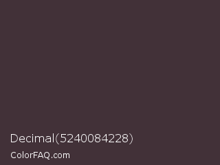 Decimal 5240084228 Color is a dark rose color and the nearest color is Woody Brown #483131. Hex code #423138 and RGB value is rgb(66,49,56). In RGB color space, this color is composed of 26% red, 19% green, 22% blue, In CMYK color space, this color is composed of 0% cyan, 26% magenta, 15% yellow , 74% black , In HSL color space, this color has a hue angle of 335° , 15% saturation and 23% lightness.