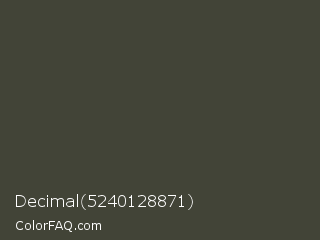 Decimal 5240128871 Color is a dark yellow color and the nearest color is Kelp #454936. Hex code #424437 and RGB value is rgb(66,68,55). In RGB color space, this color is composed of 26% red, 27% green, 22% blue, In CMYK color space, this color is composed of 3% cyan, 0% magenta, 19% yellow , 73% black , In HSL color space, this color has a hue angle of 69° , 11% saturation and 24% lightness.