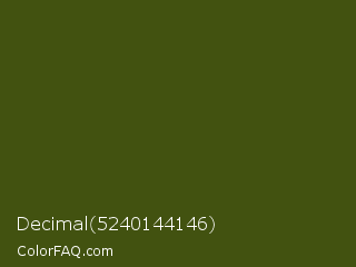 Decimal 5240144146 Color is a very dark lime color and the nearest color is Clover #384910. Hex code #425210 and RGB value is rgb(66,82,16). In RGB color space, this color is composed of 26% red, 32% green, 6% blue, In CMYK color space, this color is composed of 20% cyan, 0% magenta, 80% yellow , 68% black , In HSL color space, this color has a hue angle of 75° , 67% saturation and 19% lightness.