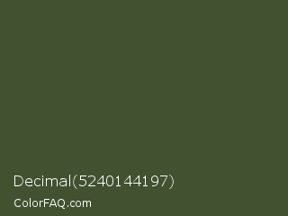 Decimal 5240144197 Color is a dark green color and the nearest color is Rifle Green #444c38. Hex code #425231 and RGB value is rgb(66,82,49). In RGB color space, this color is composed of 26% red, 32% green, 19% blue, In CMYK color space, this color is composed of 20% cyan, 0% magenta, 40% yellow , 68% black , In HSL color space, this color has a hue angle of 89° , 25% saturation and 26% lightness.