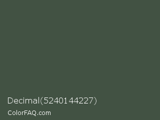Decimal 5240144227 Color is a dark green color and the nearest color is Gray Asparagus #465945. Hex code #425243 and RGB value is rgb(66,82,67). In RGB color space, this color is composed of 26% red, 32% green, 26% blue, In CMYK color space, this color is composed of 20% cyan, 0% magenta, 18% yellow , 68% black , In HSL color space, this color has a hue angle of 124° , 11% saturation and 29% lightness.