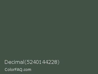 Decimal 5240144228 Color is a dark green color and the nearest color is Gray Asparagus #465945. Hex code #425244 and RGB value is rgb(66,82,68). In RGB color space, this color is composed of 26% red, 32% green, 27% blue, In CMYK color space, this color is composed of 20% cyan, 0% magenta, 17% yellow , 68% black , In HSL color space, this color has a hue angle of 128° , 11% saturation and 29% lightness.