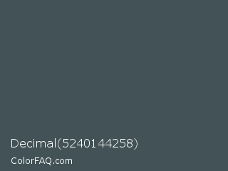 Decimal 5240144258 Color is a dark cyan color and the nearest color is River Bed #434c59. Hex code #425256 and RGB value is rgb(66,82,86). In RGB color space, this color is composed of 26% red, 32% green, 34% blue, In CMYK color space, this color is composed of 23% cyan, 5% magenta, 0% yellow , 66% black , In HSL color space, this color has a hue angle of 192° , 13% saturation and 30% lightness.