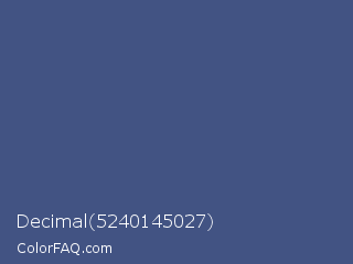 Decimal 5240145027 Color is a normal blue color and the nearest color is East Bay #414c7d. Hex code #425383 and RGB value is rgb(66,83,131). In RGB color space, this color is composed of 26% red, 33% green, 51% blue, In CMYK color space, this color is composed of 50% cyan, 37% magenta, 0% yellow , 49% black , In HSL color space, this color has a hue angle of 224° , 33% saturation and 39% lightness.