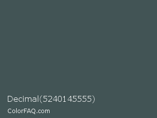 Decimal 5240145555 Color is a dark cyan color and the nearest color is River Bed #434c59. Hex code #425455 and RGB value is rgb(66,84,85). In RGB color space, this color is composed of 26% red, 33% green, 33% blue, In CMYK color space, this color is composed of 22% cyan, 1% magenta, 0% yellow , 67% black , In HSL color space, this color has a hue angle of 183° , 13% saturation and 30% lightness.