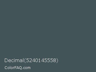 Decimal 5240145558 Color is a dark cyan color and the nearest color is River Bed #434c59. Hex code #425458 and RGB value is rgb(66,84,88). In RGB color space, this color is composed of 26% red, 33% green, 35% blue, In CMYK color space, this color is composed of 25% cyan, 5% magenta, 0% yellow , 65% black , In HSL color space, this color has a hue angle of 191° , 14% saturation and 30% lightness.