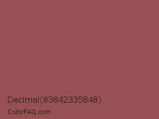 Decimal 83842335848 Color is a normal red color and the nearest color is Middle Red Purple #a55353. Hex code #975154 and RGB value is rgb(151,81,84). In RGB color space, this color is composed of 59% red, 32% green, 33% blue, In CMYK color space, this color is composed of 0% cyan, 46% magenta, 44% yellow , 41% black , In HSL color space, this color has a hue angle of 357° , 30% saturation and 45% lightness.