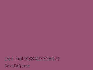 Decimal 83842335897 Color is a normal rose color and the nearest color is Sugar Plum #914e75. Hex code #975173 and RGB value is rgb(151,81,115). In RGB color space, this color is composed of 59% red, 32% green, 45% blue, In CMYK color space, this color is composed of 0% cyan, 46% magenta, 24% yellow , 41% black , In HSL color space, this color has a hue angle of 331° , 30% saturation and 45% lightness.
