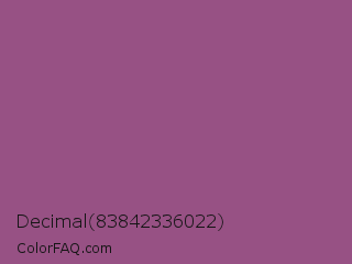 Decimal 83842336022 Color is a normal magenta color and the nearest color is Razzmic Berry #8d4e85. Hex code #975184 and RGB value is rgb(151,81,132). In RGB color space, this color is composed of 59% red, 32% green, 52% blue, In CMYK color space, this color is composed of 0% cyan, 46% magenta, 13% yellow , 41% black , In HSL color space, this color has a hue angle of 316° , 30% saturation and 45% lightness.