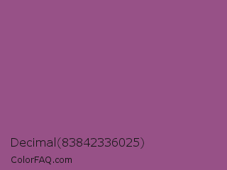 Decimal 83842336025 Color is a normal magenta color and the nearest color is Razzmic Berry #8d4e85. Hex code #975187 and RGB value is rgb(151,81,135). In RGB color space, this color is composed of 59% red, 32% green, 53% blue, In CMYK color space, this color is composed of 0% cyan, 46% magenta, 11% yellow , 41% black , In HSL color space, this color has a hue angle of 314° , 30% saturation and 45% lightness.