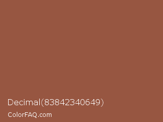 Decimal 83842340649 Color is a normal color and the nearest color is Coconut #965a3e. Hex code #975641 and RGB value is rgb(151,86,65). In RGB color space, this color is composed of 59% red, 34% green, 25% blue, In CMYK color space, this color is composed of 0% cyan, 43% magenta, 57% yellow , 41% black , In HSL color space, this color has a hue angle of 15° , 40% saturation and 42% lightness.