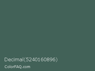 Decimal 5240160896 Color is a normal green color and the nearest color is Mineral Green #3f5d53. Hex code #426258 and RGB value is rgb(66,98,88). In RGB color space, this color is composed of 26% red, 38% green, 35% blue, In CMYK color space, this color is composed of 33% cyan, 0% magenta, 10% yellow , 62% black , In HSL color space, this color has a hue angle of 161° , 20% saturation and 32% lightness.