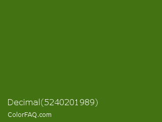 Decimal 5240201989 Color is a dark green color and the nearest color is Green Leaf #436a0d. Hex code #427211 and RGB value is rgb(66,114,17). In RGB color space, this color is composed of 26% red, 45% green, 7% blue, In CMYK color space, this color is composed of 42% cyan, 0% magenta, 85% yellow , 55% black , In HSL color space, this color has a hue angle of 90° , 74% saturation and 26% lightness.