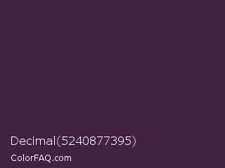Decimal 5240877395 Color is a very dark magenta color and the nearest color is Blackcurrant #32293a. Hex code #432141 and RGB value is rgb(67,33,65). In RGB color space, this color is composed of 26% red, 13% green, 25% blue, In CMYK color space, this color is composed of 0% cyan, 51% magenta, 3% yellow , 74% black , In HSL color space, this color has a hue angle of 304° , 34% saturation and 20% lightness.