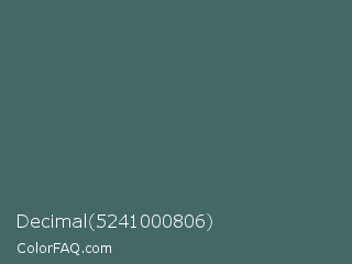 Decimal 5241000806 Color is a normal cyan color and the nearest color is Deep Space Sparkle #4a646c. Hex code #436866 and RGB value is rgb(67,104,102). In RGB color space, this color is composed of 26% red, 41% green, 40% blue, In CMYK color space, this color is composed of 36% cyan, 0% magenta, 2% yellow , 59% black , In HSL color space, this color has a hue angle of 177° , 22% saturation and 34% lightness.