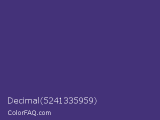 Decimal 5241335959 Color is a normal indigo color and the nearest color is Minsk #3f307f. Hex code #443279 and RGB value is rgb(68,50,121). In RGB color space, this color is composed of 27% red, 20% green, 47% blue, In CMYK color space, this color is composed of 44% cyan, 59% magenta, 0% yellow , 53% black , In HSL color space, this color has a hue angle of 255° , 42% saturation and 34% lightness.