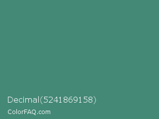 Decimal 5241869158 Color is a normal green color and the nearest color is Viridian #40826d. Hex code #448976 and RGB value is rgb(68,137,118). In RGB color space, this color is composed of 27% red, 54% green, 46% blue, In CMYK color space, this color is composed of 50% cyan, 0% magenta, 14% yellow , 46% black , In HSL color space, this color has a hue angle of 163° , 34% saturation and 40% lightness.
