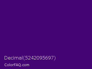 Decimal 5242095697 Color is a dark purple color and the nearest color is Windsor #3c0878. Hex code #450473 and RGB value is rgb(69,4,115). In RGB color space, this color is composed of 27% red, 2% green, 45% blue, In CMYK color space, this color is composed of 40% cyan, 97% magenta, 0% yellow , 55% black , In HSL color space, this color has a hue angle of 275° , 93% saturation and 23% lightness.