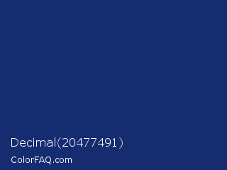 Decimal 20477491 Color is a dark blue color and the nearest color is Catalina Blue #062a78. Hex code #152c71 and RGB value is rgb(21,44,113). In RGB color space, this color is composed of 8% red, 17% green, 44% blue, In CMYK color space, this color is composed of 81% cyan, 61% magenta, 0% yellow , 56% black , In HSL color space, this color has a hue angle of 225° , 69% saturation and 26% lightness.
