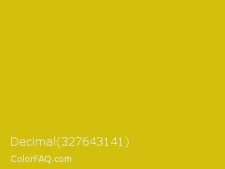 Decimal 327643141 Color is a normal yellow color and the nearest color is Gold Tips #deba13. Hex code #d3bf0d and RGB value is rgb(211,191,13). In RGB color space, this color is composed of 83% red, 75% green, 5% blue, In CMYK color space, this color is composed of 0% cyan, 9% magenta, 94% yellow , 17% black , In HSL color space, this color has a hue angle of 54° , 88% saturation and 44% lightness.
