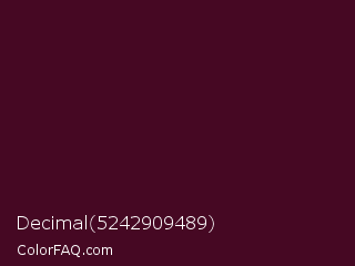 Decimal 5242909489 Color is a very dark rose color and the nearest color is Barossa #44012d. Hex code #460823 and RGB value is rgb(70,8,35). In RGB color space, this color is composed of 27% red, 3% green, 14% blue, In CMYK color space, this color is composed of 0% cyan, 89% magenta, 50% yellow , 73% black , In HSL color space, this color has a hue angle of 334° , 79% saturation and 15% lightness.