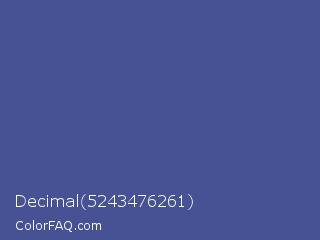 Decimal 5243476261 Color is a normal blue color and the nearest color is Victoria #534491. Hex code #475295 and RGB value is rgb(71,82,149). In RGB color space, this color is composed of 28% red, 32% green, 58% blue, In CMYK color space, this color is composed of 52% cyan, 45% magenta, 0% yellow , 42% black , In HSL color space, this color has a hue angle of 232° , 35% saturation and 43% lightness.