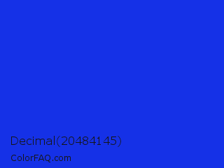 Decimal 20484145 Color is a normal blue color and the nearest color is Palatinate Blue #273be2. Hex code #1531e7 and RGB value is rgb(21,49,231). In RGB color space, this color is composed of 8% red, 19% green, 91% blue, In CMYK color space, this color is composed of 91% cyan, 79% magenta, 0% yellow , 9% black , In HSL color space, this color has a hue angle of 232° , 83% saturation and 49% lightness.