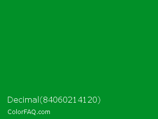 Decimal 84060214120 Color is a dark green color and the nearest color is North Texas Green #059033. Hex code #019028 and RGB value is rgb(1,144,40). In RGB color space, this color is composed of 0% red, 56% green, 16% blue, In CMYK color space, this color is composed of 99% cyan, 0% magenta, 72% yellow , 44% black , In HSL color space, this color has a hue angle of 136° , 99% saturation and 28% lightness.
